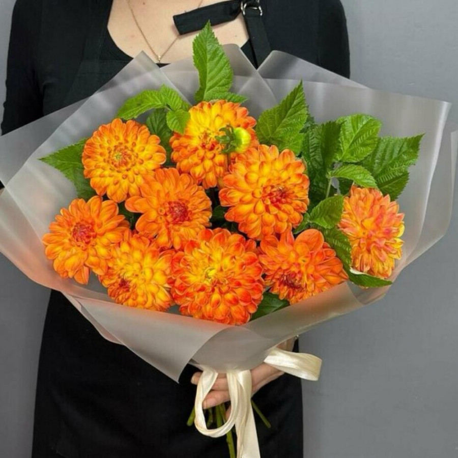 На фото букет из 9 оранжевых георгин. В составе: георгина 9 шт, зелень 3 шт, дизайнерская упаковка 1 шт, атласная лента 1 шт, . Все цветы свежие и ароматные, букет красиво оформлен и отлично подходит для подарка. Доступна доставка цветов или самовывоз.