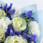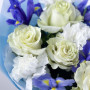 Букет из белых гвоздик, синих ирисов и белых роз в Северодвинске
