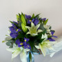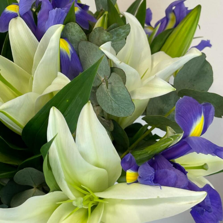 Букет из белых лилий с синими ирисами в Северодвинске